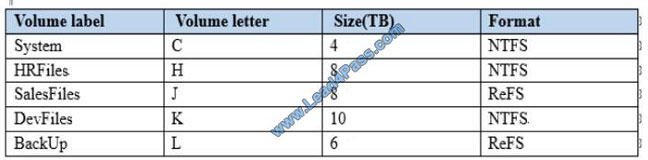 You manage a file server that runs Windows Server 2016. The file server contains the volumes configured as shown in
